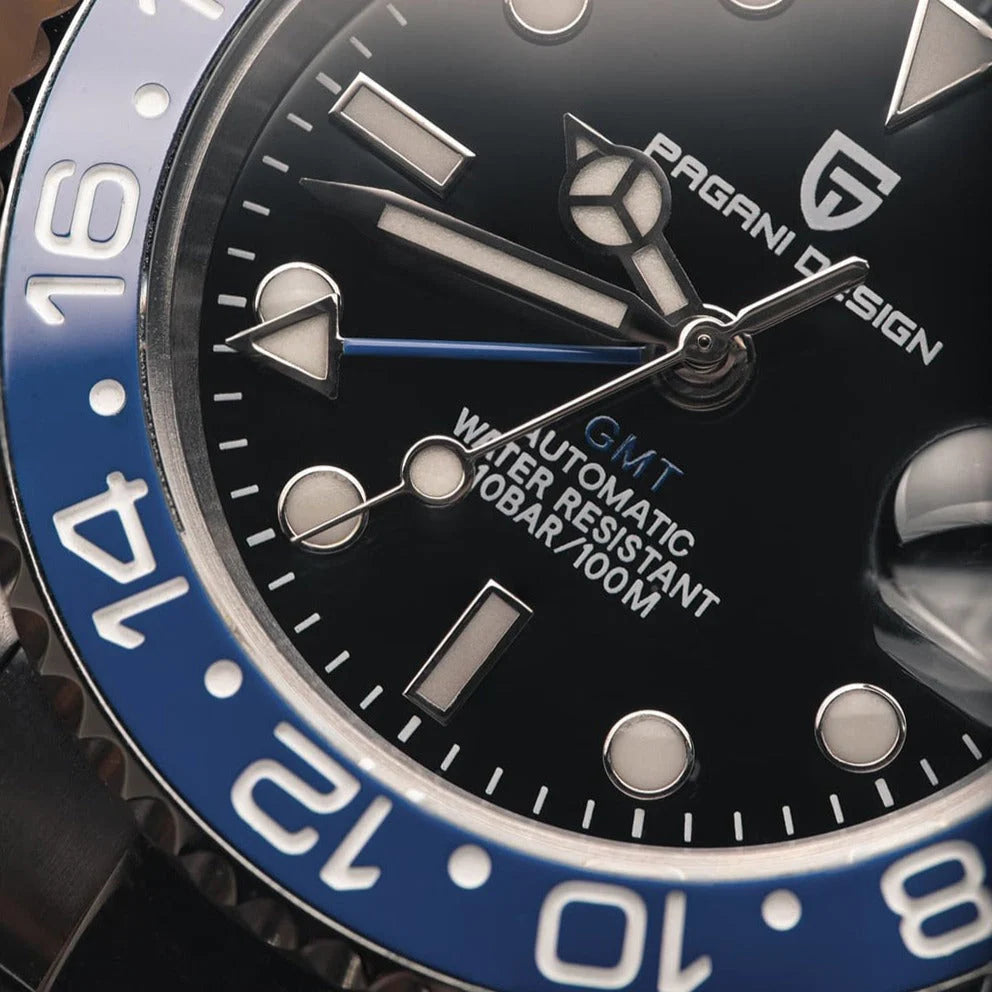 Sapphire crystal, ceramic bezel in Black, Black Blue and Rose-Gold colors, dual time zone, 316L surgical stainless steel, and 330ft water-resistant.